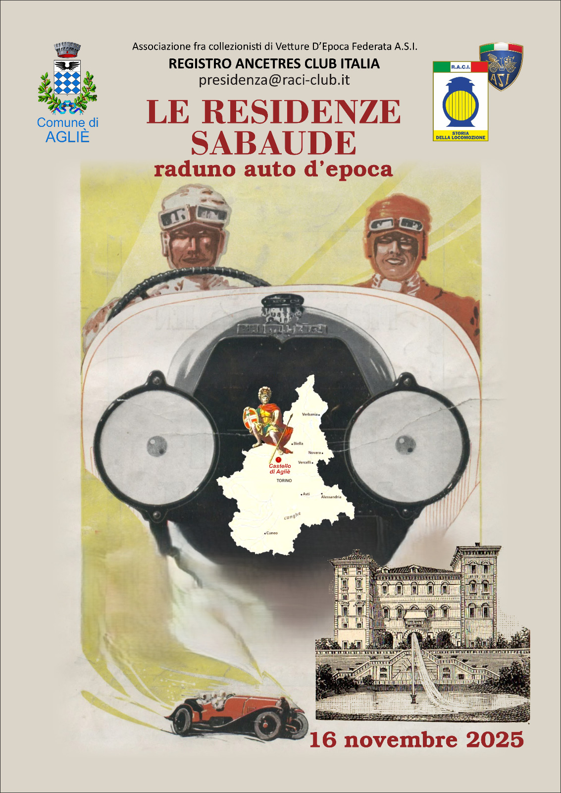 [16/10/2025] Il RACI sta organizzado per i soci iscritti, la prima tappa di una serie di raduni intitolata "Le Residenze Sabaude" presso il Castello Ducale di Aglič il 18 Novembre 2025